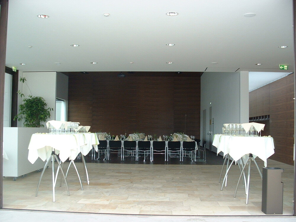 Das lichtdurchflutete Foyer kann problemlos mit dem Saal zu einer einzigen Einheit umgewandelt werden. Im Saal stehen bei Bedarf Lautsprecheranlage, Mikrofon und Beamer zur Verfügung. Der Gruppenraum verfügt ebenso über einen Beamer.