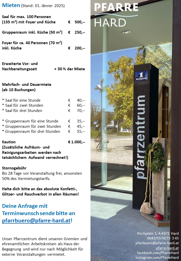 Unser Pfarrzentrum bietet aufgrund seiner guten Infrastruktur, aber auch wegen seiner idealen Lage, einen nahezu perfekten Rahmen für jegliche Art von Veranstaltung. Die Räumlichkeiten können individuell hergerichtet werden – ganz nach Belieben. Somit finden Jahreshauptversammlungen, Vorträge und Seminare sowie hauseigene Veranstaltungen im Pfarrzentrum ihren idealen Platz.