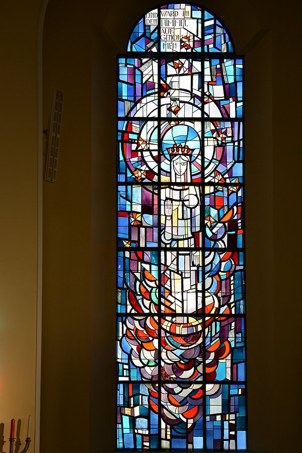 li. Maria als Gleichnis der Kirche Christi, bezeichnet "Entwurf Leopold Fetz, Ausführung Glas Marte"