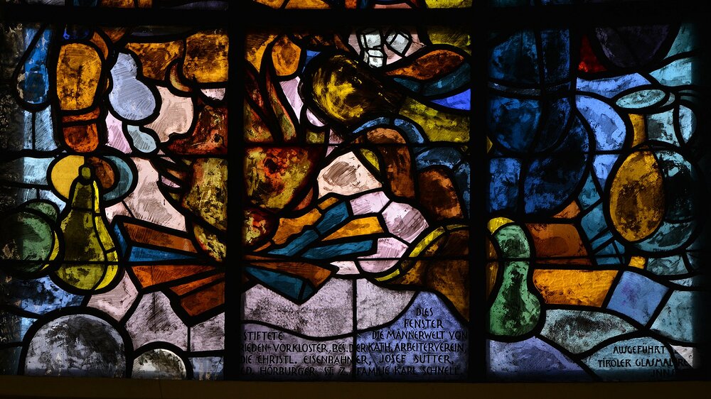 Dies Fenster stiftete die Männerwelt von Rieden-Vorkloster bes. der kath. Arbeiterverein, die christl. Eisenbahner